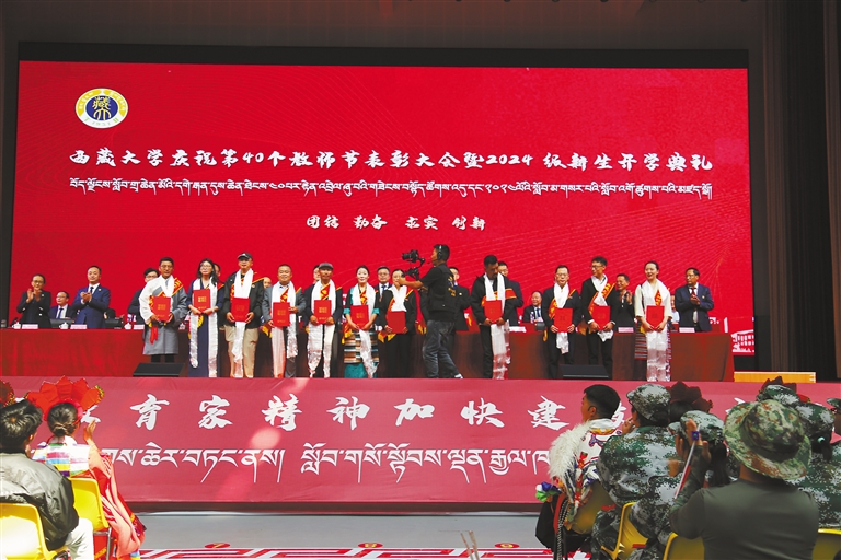 10日下午,西藏大學(xué)在納金校區(qū)雙創(chuàng)活動(dòng)中心舉辦第40個(gè)教師節(jié)表彰大會(huì)暨2024級(jí)新生開學(xué)典禮?;顒?dòng)在熱情歡快的暖場歌舞中拉開帷幕,會(huì)場內(nèi)紅旗飄揚(yáng),氣氛熱烈而莊重,全體2024級(jí)新生、學(xué)校各單位主要負(fù)責(zé)人、受表彰師生代表等共計(jì)3300余師生齊聚一堂,共同見證這一重要時(shí)刻。