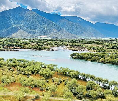 雅魯藏布江與尼洋河的交匯處,碧波蕩漾,草木蔥蘢,沙洲綠樹(shù)蓬勃盎然。