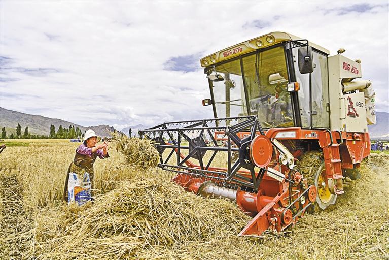 山南市扎囊縣扎其鄉(xiāng)朗賽嶺村青稞收獲現(xiàn)場(chǎng)。 新華社記者 張汝鋒 攝