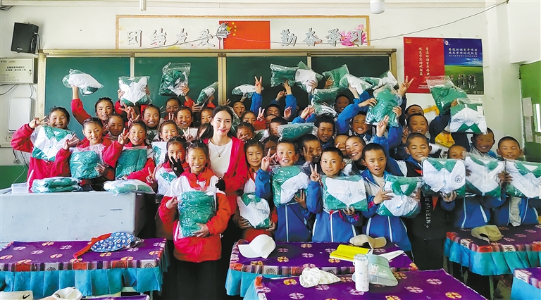 2014年至今,日喀則市南木林縣黨員扎西拉姆積極投身慈善事業(yè),用無私奉獻詮釋著鄰里守望相助和民族團結的真諦。圖為扎西拉姆(中)與受助孩子合影。