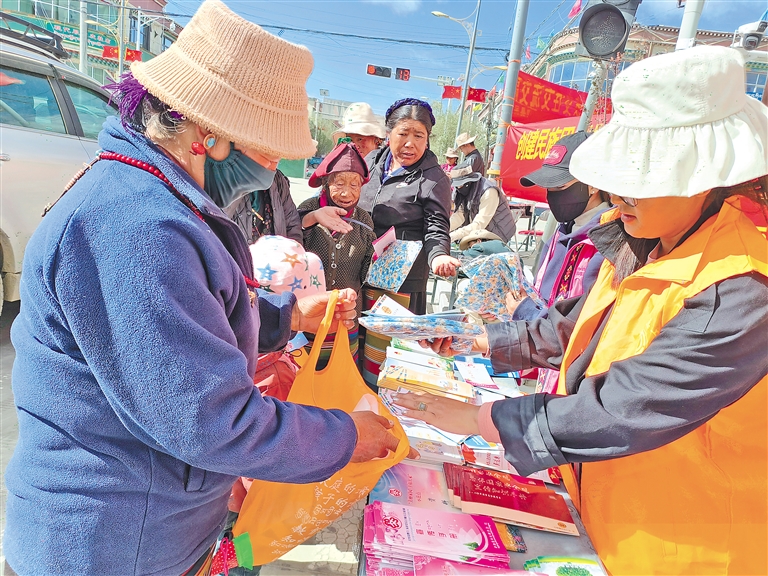 圖為薩迦縣民族團結進步宣傳活動月啟動儀式上,工作人員發(fā)放宣傳冊。