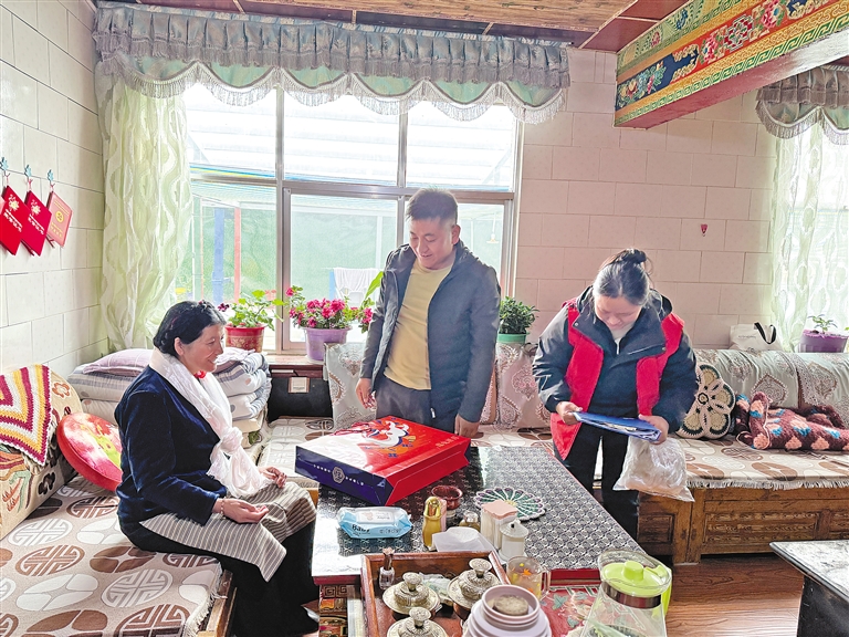 圖為亞東縣帕里鎮(zhèn)工作人員在民族團結通婚家庭開展走訪慰問。(本版圖片均由記者 扎西頓珠 楊子彥 旦增嘎瓦 攝)