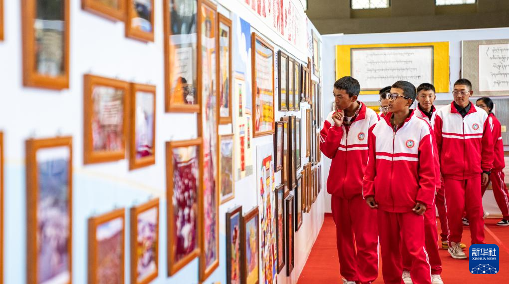 學(xué)生在西藏首屆中小學(xué)生藝術(shù)展演活動(dòng)獲獎(jiǎng)作品展廳內(nèi)參觀(9月25日攝)。新華社記者 丁增尼達(dá) 攝