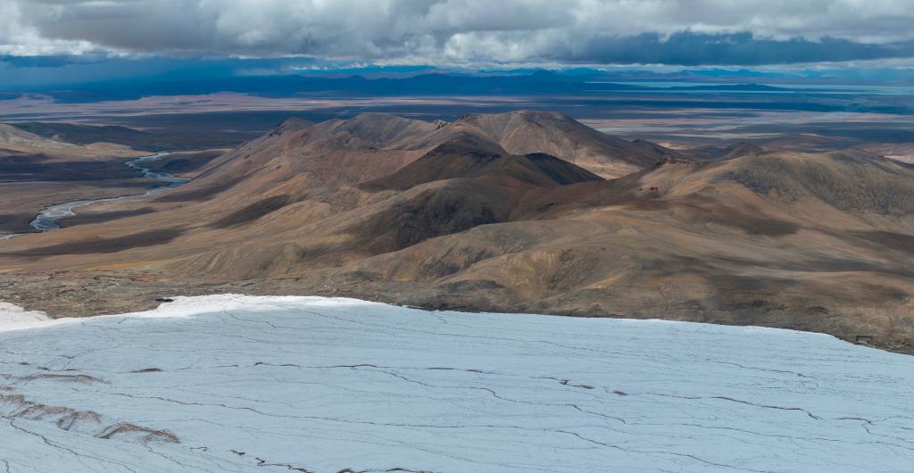這是9月4日拍攝的普若崗日冰原8號冰川、消融形成的徑流以及遠處的令戈錯(無人機拼接照片)。新華社記者 姜帆 攝
