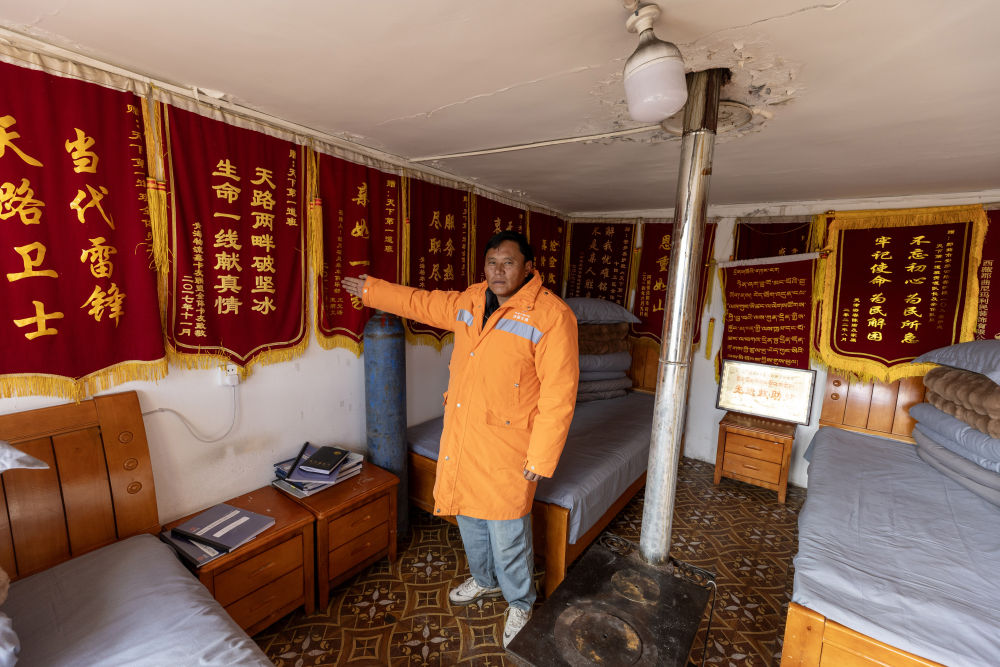 這里的救助站吸引了記者的注意。進(jìn)入房間,內(nèi)有床鋪、氧氣瓶、抗高反藥等物品,四面墻上掛滿錦旗。一封毛筆書寫的紅底感謝信格外顯眼,信中表達(dá)了對(duì)地嘎、東力、次仁多吉三名養(yǎng)路工人的感謝。信中寫道:“在那漫長的10個(gè)小時(shí)里,你們不顧危險(xiǎn)和疲憊,想盡辦法讓我脫險(xiǎn)。”