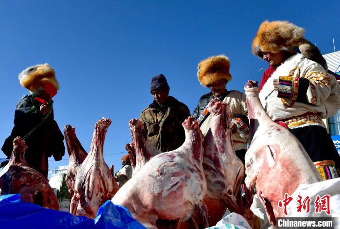 12月6日,西藏自治區(qū)那曲市申扎縣第十八屆畜產(chǎn)品展銷會現(xiàn)場,民眾挑選羊肉。李林 攝