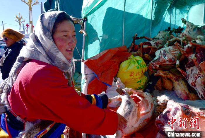 12月6日,西藏自治區(qū)那曲市申扎縣第十八屆畜產(chǎn)品展銷(xiāo)會(huì)現(xiàn)場(chǎng),牧民整理售賣(mài)的羊肉?!±盍?攝