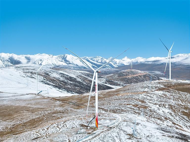 在昌都市大唐八宿風電項目現(xiàn)場,一排排高大的“風車”矗立其間,不遠處七八輛運輸車輛來回穿梭,百米高的風機上,工人正在高空作業(yè)。