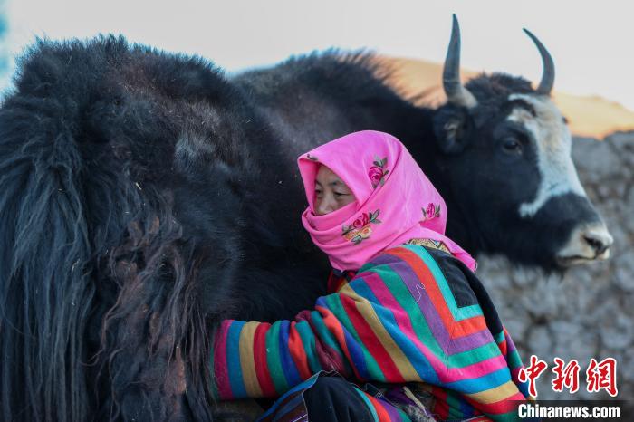 12月12日,西藏自治區(qū)那曲市安多縣帕那鎮(zhèn)牧民土巴卓瑪準備去擠牦牛奶。中新社記者 貢嘎來松 攝