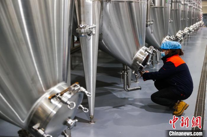 圖為工作人員檢查儲(chǔ)酒罐。中新社記者 薛蒂 攝