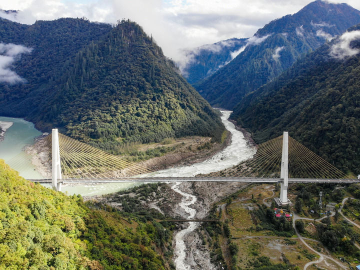 2019年10月27日拍攝的川藏公路通麥路段上的迫龍溝特大橋(無(wú)人機(jī)照片)。迫龍溝特大橋位于西藏林芝市波密縣境內(nèi),是西藏自治區(qū)內(nèi)最大的公路雙塔斜拉橋。新華社記者 孫非 攝