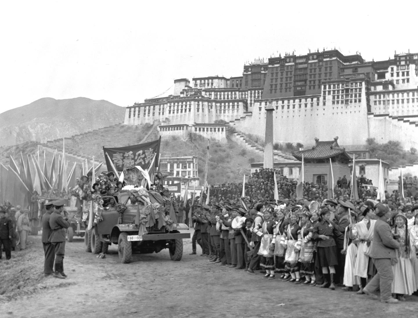 1954年12月25日,在西藏拉薩布達(dá)拉宮前舉行的通車典禮上,拉薩市群眾歡迎從青藏公路開到拉薩的汽車隊。