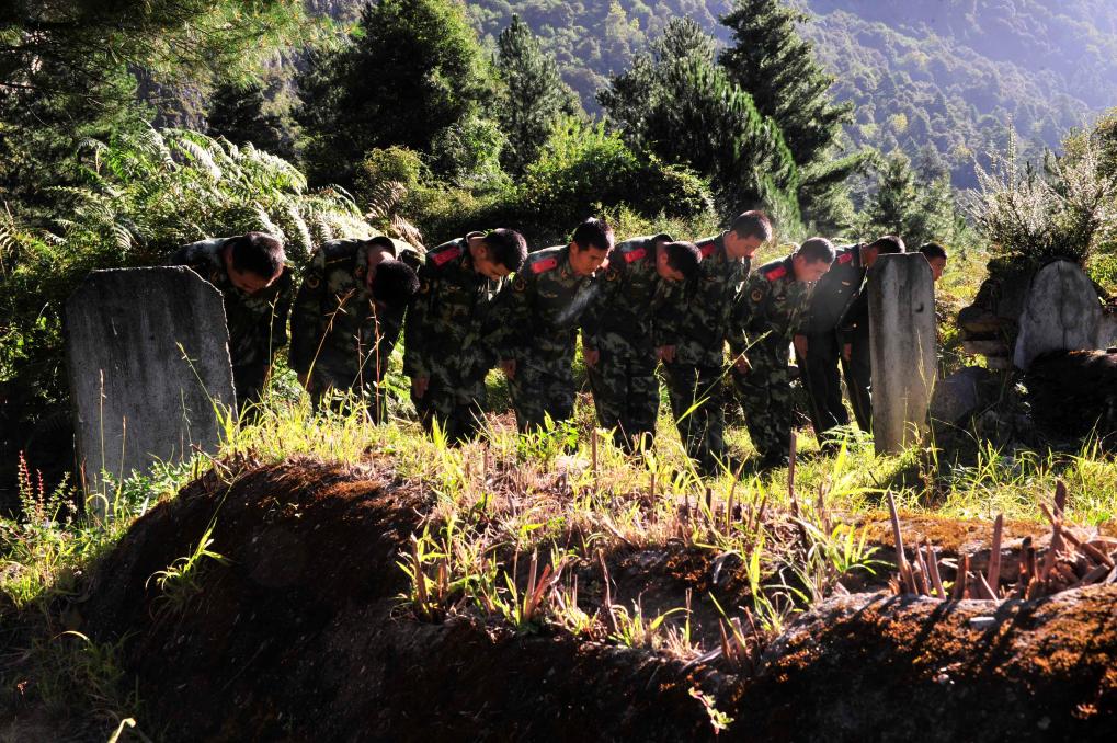 2014年9月18日,武警交通二支隊的官兵在波密縣烈士陵園祭奠烈士。在川藏公路沿線的許多地方,都有為當(dāng)年筑路部隊和當(dāng)代護(hù)路部隊因公犧牲的烈士所建的陵園。