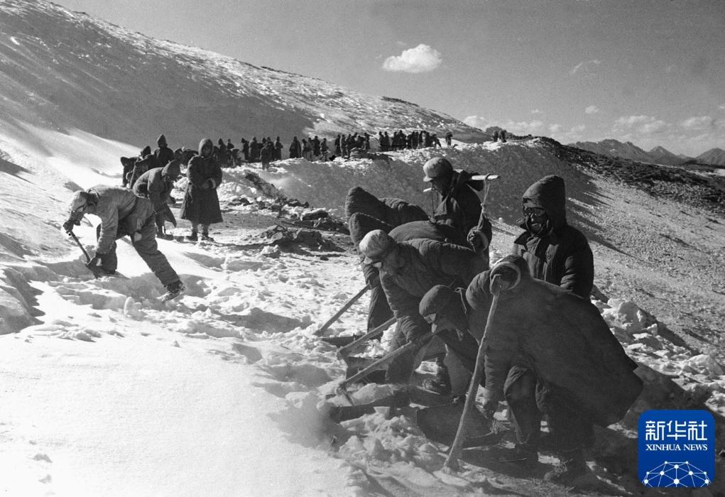1952年,筑路民工在甲皮拉山頂鏟除冰雪,讓汽車(chē)通過(guò)。新華社記者 趙慎應(yīng) 攝
