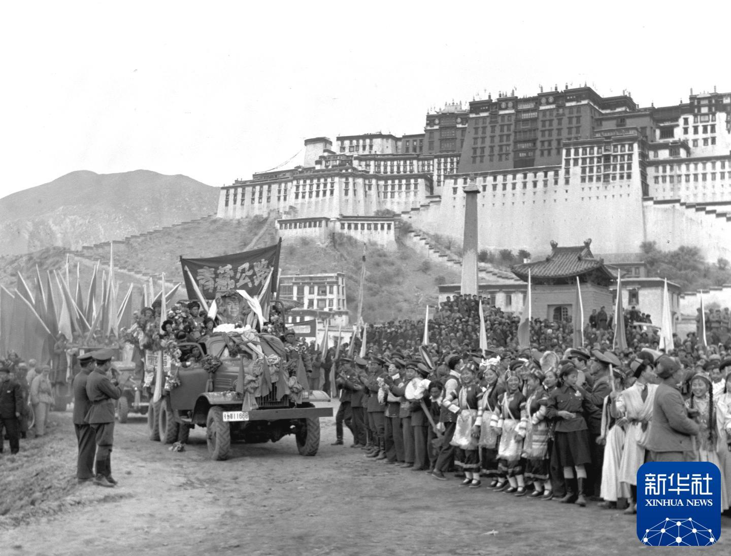 1954年12月25日,川藏公路、青藏公路同時(shí)正式通車(chē)。這是通車(chē)儀式在西藏拉薩舉行。新華社發(fā)