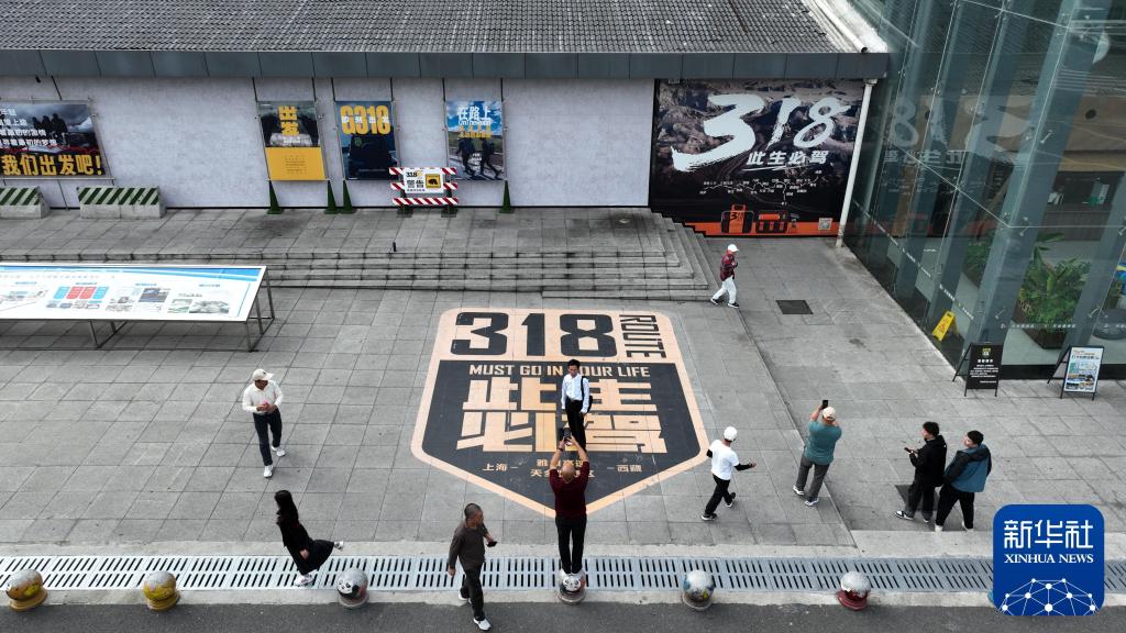 2024年10月27日,游客在雅康高速天全服務(wù)區(qū)地標(biāo)圖案前拍照(無(wú)人機(jī)照片)。新華社記者 胥冰潔 攝