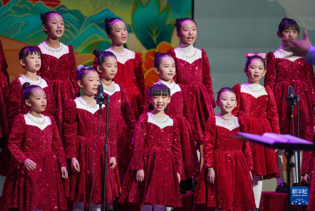 12月28日晚,西藏珠峰少年合唱團(tuán)學(xué)員代表合唱歌曲《快快走唱首歌》。
