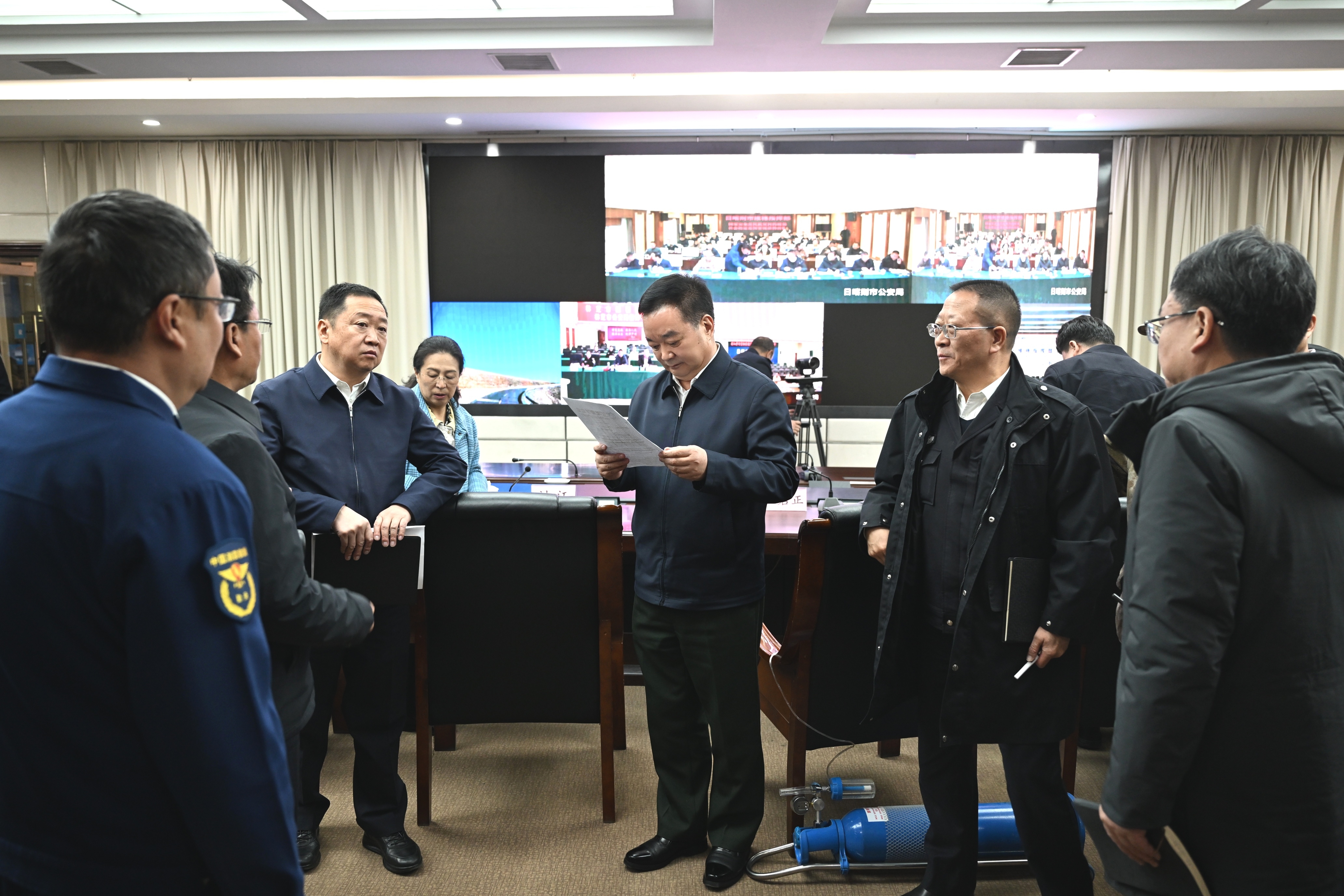 1月7日,自治區(qū)黨委書記王君正在自治區(qū)維穩(wěn)指揮部調度部署日喀則市定日縣6.8級地震抗震救災工作。記者 旦增西旦 攝