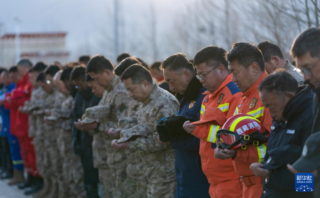 1月13日上午9時(shí)30分,西藏定日6.8級(jí)地震遇難同胞悼念儀式在受災(zāi)最嚴(yán)重的長(zhǎng)所鄉(xiāng)舉行。參與救援的解放軍和武警官兵、消防救援人員、公安民警、醫(yī)護(hù)人員、青年志愿者及有關(guān)企業(yè)員工、干部職工、震區(qū)群眾代表數(shù)百人,脫帽肅立,向遇難同胞默哀3分鐘。新華社記者 丁增尼達(dá) 攝