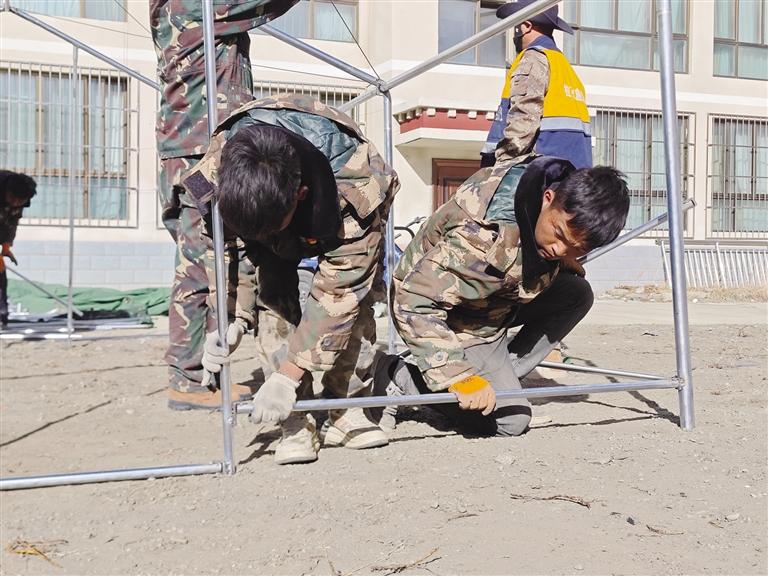 來自日喀則市江孜縣的次仁加措,雖然年僅23歲,眼神中透露出一種不容置疑的堅(jiān)定。他一邊熟練地搭著帳篷,一邊說:“我們是軍人,哪怕退伍了,這份責(zé)任也永遠(yuǎn)在肩上?!币慌?,普瓊達(dá)瓦正在卸載著救援物資,汗水從他的額頭滑落到塵土中。次仁旺加和邊巴扎西則在一旁協(xié)助搭建帳篷。他們的雙手早已磨出了紅印,但手中的活卻一刻也沒有停下。