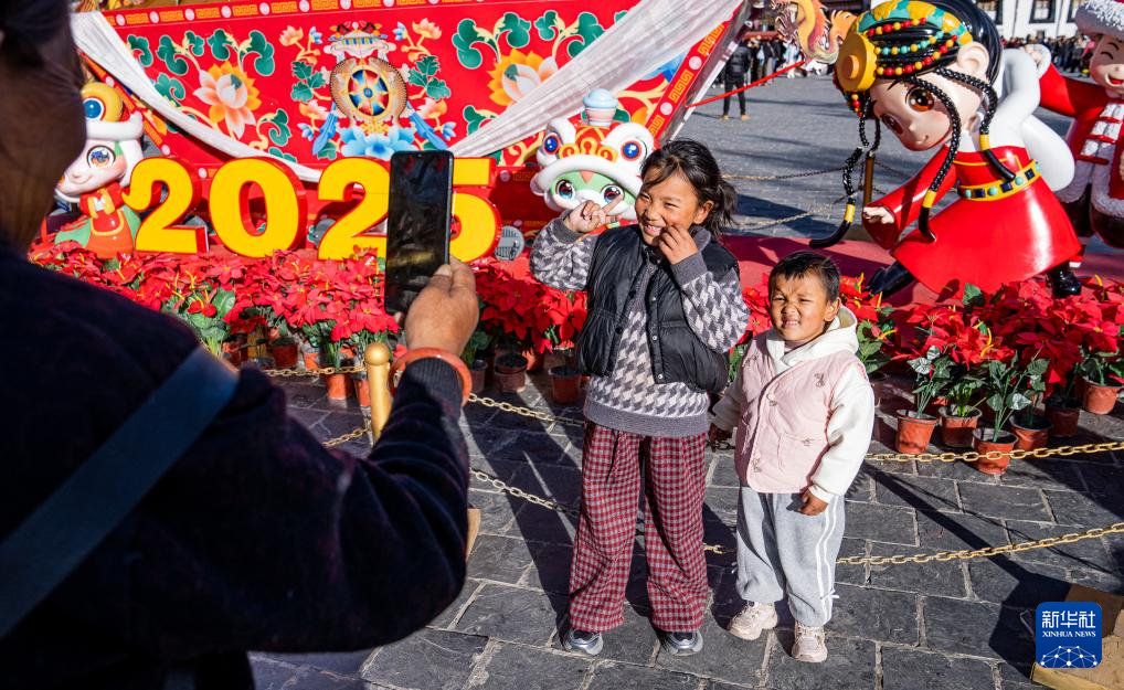 2月2日,市民在拉薩市八廓街的新年裝飾前為孩子們拍照。新華社記者 丁增尼達(dá) 攝