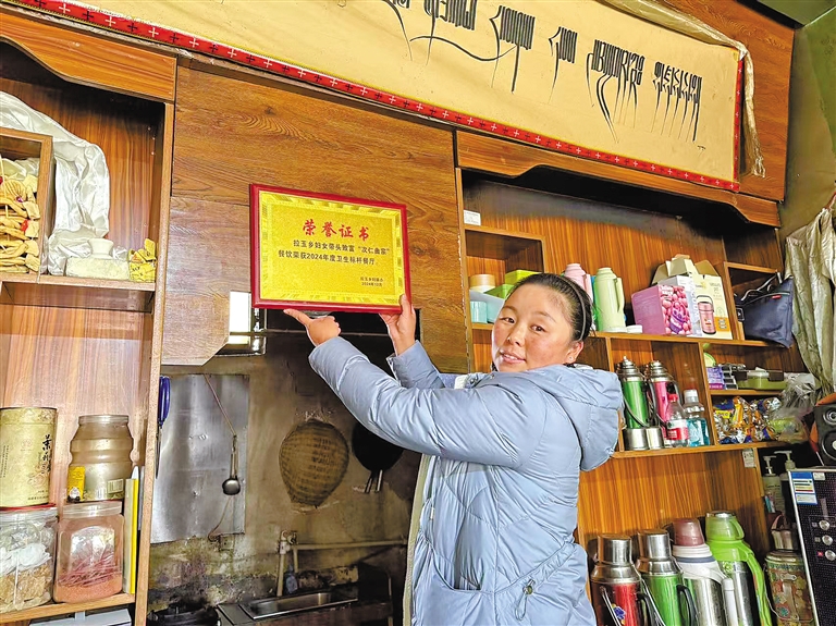 圖為次仁曲宗在門(mén)店懸掛“衛(wèi)生標(biāo)桿”獎(jiǎng)牌。記者 孫開(kāi)遠(yuǎn) 索朗曲珍 攝