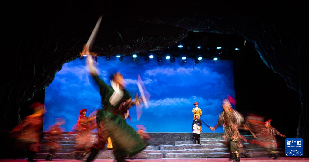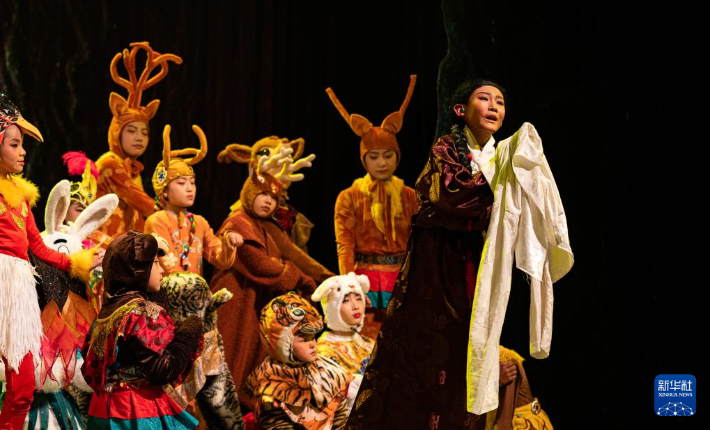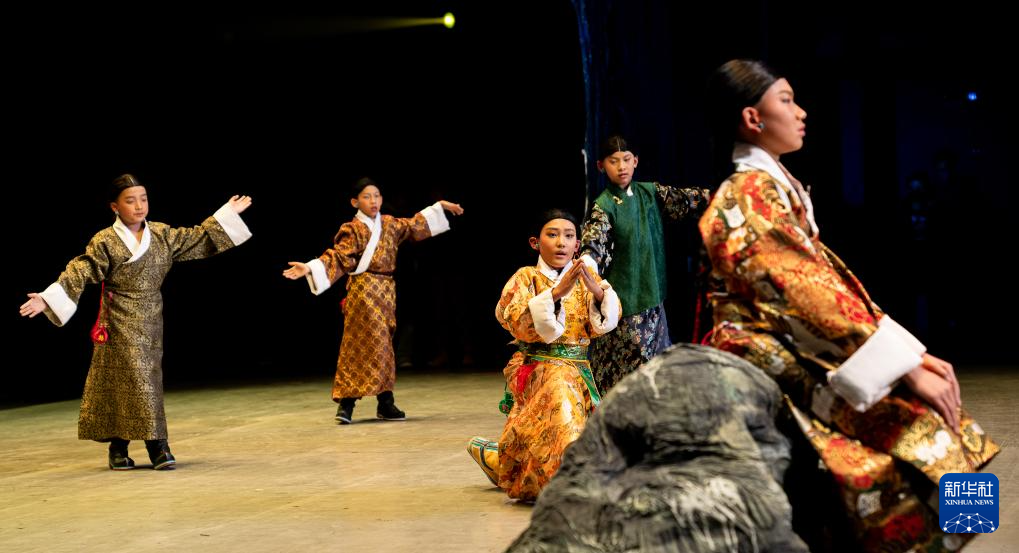 這是西藏首部少兒舞臺(tái)劇藏戲《頓月頓珠》演出現(xiàn)場,羅桑朗覺(右三)在劇中飾演“頓月”(2月11日攝)。新華社記者 丁增尼達(dá) 攝