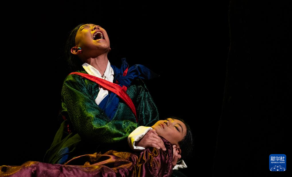 西藏首部少兒舞臺(tái)劇藏戲《頓月頓珠》演出現(xiàn)場;羅桑朗覺(右)飾演“頓月”,旦增夢(mèng)朗(左)飾演“頓珠”(2月11日攝)。新華社記者 丁增尼達(dá) 攝