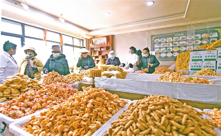 隨著藏歷新年日益臨近,拉薩街頭巷尾各種琳瑯滿(mǎn)目的“藏式”年貨,讓年味兒越來(lái)越濃,而構(gòu)成這年味兒最重要的元素之一就是“卡賽”的香味兒。“卡賽”是一種油炸面食,是藏歷新年必不可少的食物。藏歷新年前夕,古城拉薩各個(gè)加工銷(xiāo)售“卡賽”的店鋪飄出陣陣香味。