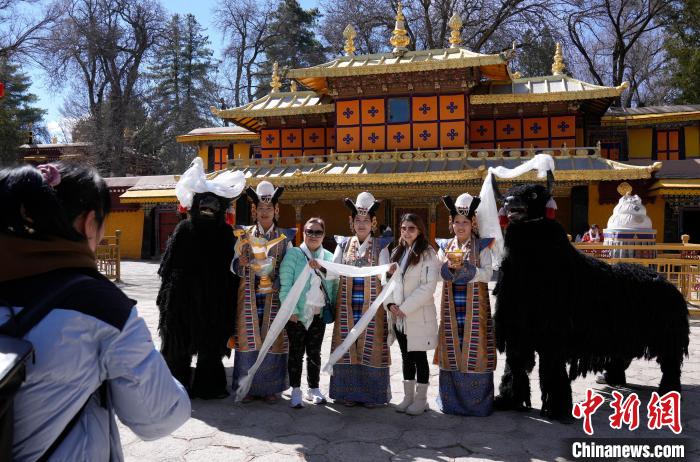 圖為歡迎儀式現(xiàn)場(chǎng),香港游客在羅布林卡與工作人員合影留念。中新社記者 李林 攝