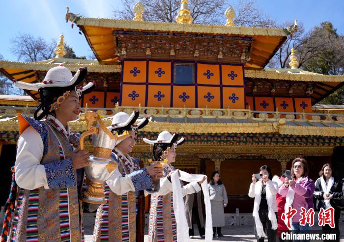 2月20日,由西藏自治區(qū)文化和旅游廳舉辦的2025年香港至拉薩航班首航旅行團(tuán)歡迎儀式在羅布林卡舉行。來(lái)自香港的游客將前往布達(dá)拉宮、大昭寺等地,開(kāi)啟冬游西藏旅途。2月19日,拉薩至香港的首條地區(qū)航線正式開(kāi)通。航線的開(kāi)通,更加便捷了兩地居民的出行,也將進(jìn)一步促進(jìn)兩地在旅游、文化、經(jīng)貿(mào)等領(lǐng)域的交流與合作。圖為歡迎儀式現(xiàn)場(chǎng),工作人員向香港游客敬獻(xiàn)青稞酒。中新社記者 李林 攝