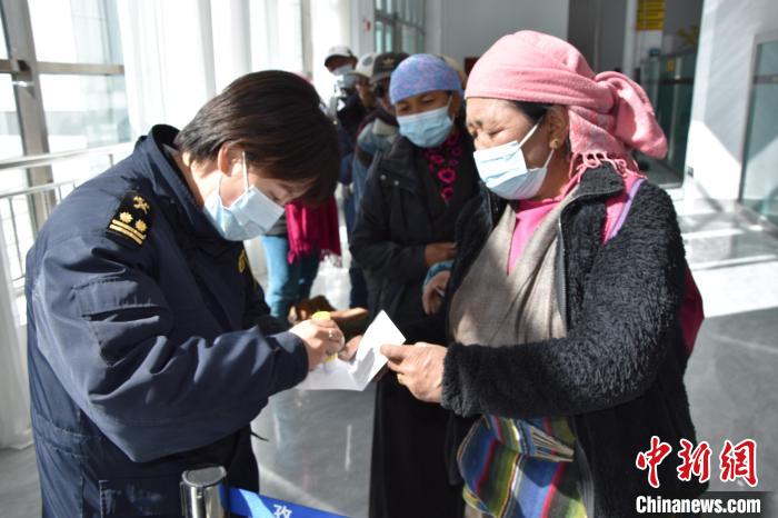圖為日喀則海關(guān)里孜口岸女關(guān)員協(xié)助入境邊民粘貼入境識別碼。拉薩海關(guān)供圖