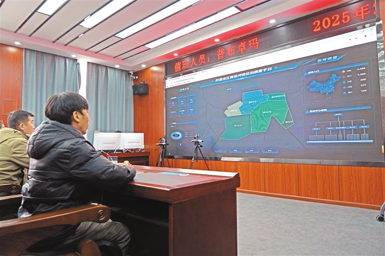 圖為噶爾縣獅泉河鎮(zhèn)綜治中心“一張網(wǎng)”調(diào)度平臺(tái)一角。 本報(bào)記者 洛桑旦增 達(dá)珍 攝