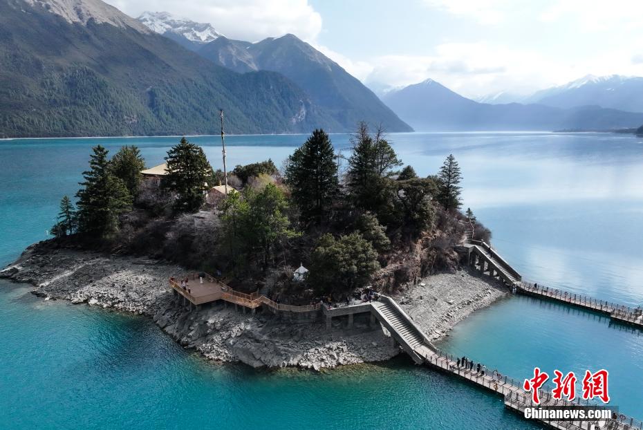 3月30日,航拍巴松措湖心島。巴松措又名錯(cuò)高湖,位于西藏自治區(qū)林芝市工布江達(dá)縣,是西藏首個(gè)自然風(fēng)景類國(guó)家5A級(jí)旅游風(fēng)景區(qū)。從空中俯瞰巴松措,碧藍(lán)的湖水被雪山、森林環(huán)繞,宛如鑲嵌在群山間的“藍(lán)寶石”。(無(wú)人機(jī)照片)中新社記者 馬銘言 攝
