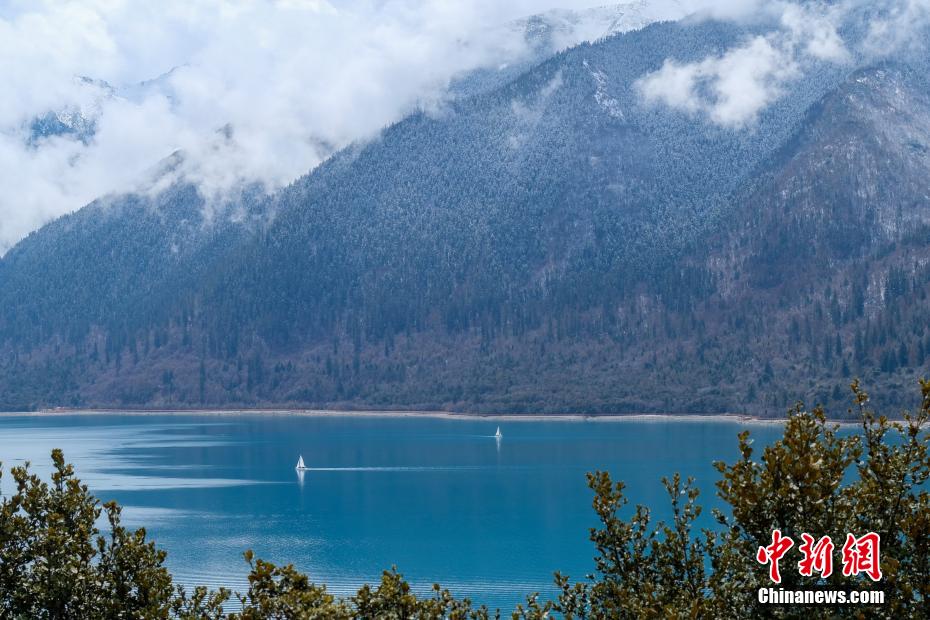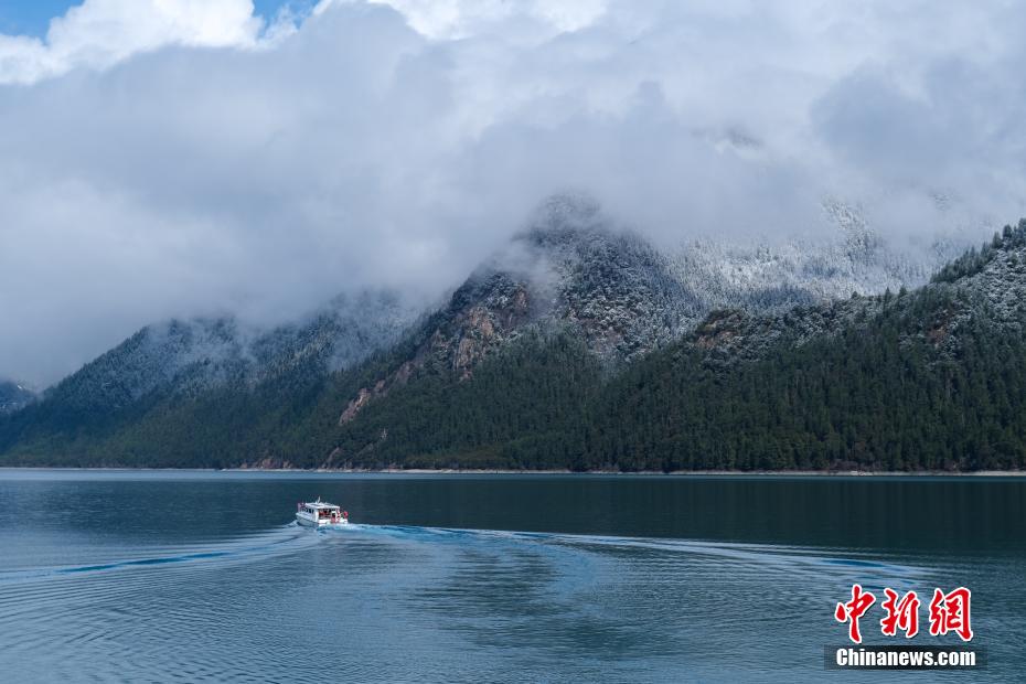 巴松錯位于西藏林芝工布江達縣境內(nèi),地處巴河上游的高山峽谷中,是西藏首個自然風景類國家5A級旅游景區(qū)。4月5日,巴松錯迎來一場春雪,雪后四周原始森林猶如蒙上潔白面紗,湖面宛如一面藍寶石鑲嵌其中,風光如畫。圖為4月5日,游客乘船游覽巴松錯。中新社記者 江飛波 攝
