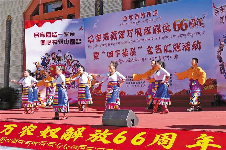 圖為拉薩市城關(guān)區(qū)金珠西路街道舉辦紀(jì)念西藏百萬(wàn)農(nóng)奴解放66周年暨“四下基層”文藝匯演活動(dòng)現(xiàn)場(chǎng)。通訊員 扈顯嶺 攝
