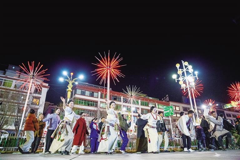 廣場東西橫穿昌都中心城區(qū),全長約150米,布局錯落有致,人流涌動。漫步在茶馬廣場,兩側(cè)有300余間商鋪,充滿了濃濃的生活氣息。最吸引我們的是廣場一側(cè)的鍋莊舞——男女老少圍成圈,跟著節(jié)奏踢踏轉(zhuǎn)圈,動作簡單卻充滿力量。