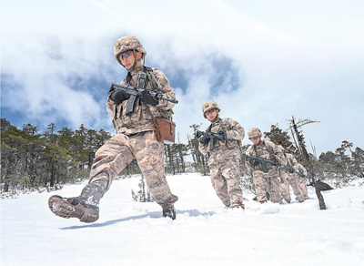 “墨脫戍邊模范營”戍邊官兵踏雪巡邏。馬軍攝