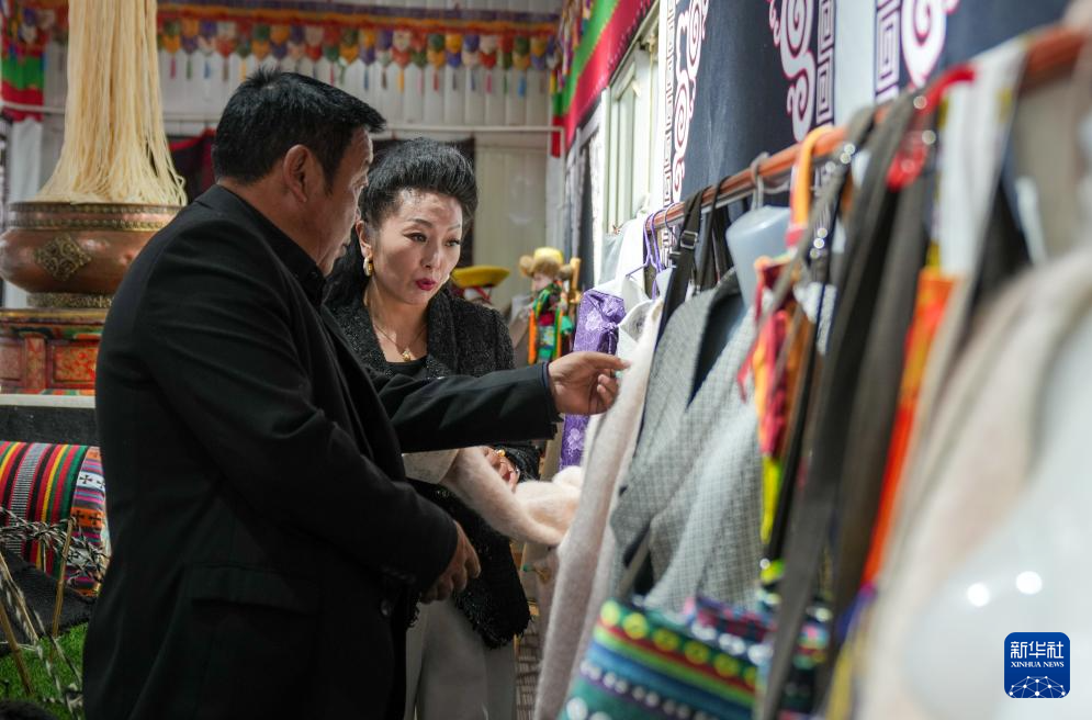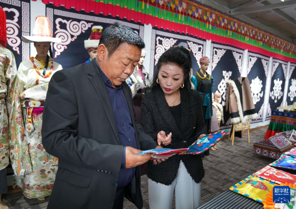 邊巴卓噶(右)和副校長(zhǎng)普布次仁在查看縫紉班學(xué)員制作的布藝作品(4月23日攝)。新華社記者 晉美多吉 攝