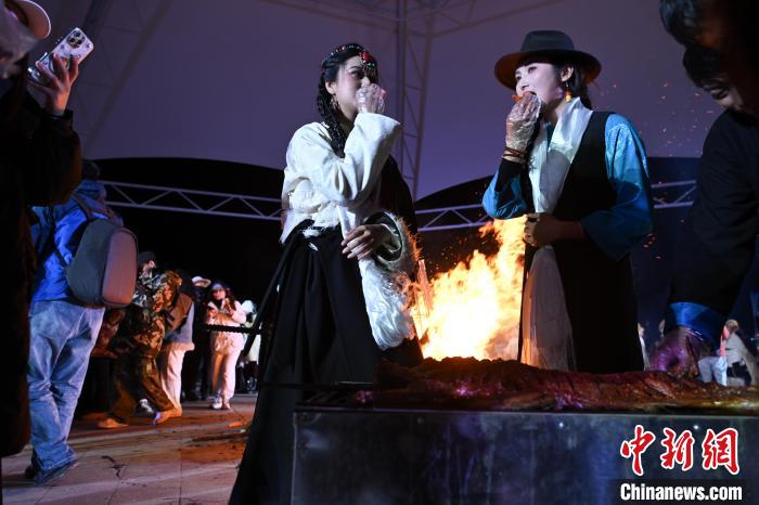 圖為游客身著藏族節(jié)日盛裝在“情定當(dāng)雄”篝火鍋莊晚會(huì)吃烤全羊。中新社記者 貢嘎來松 攝