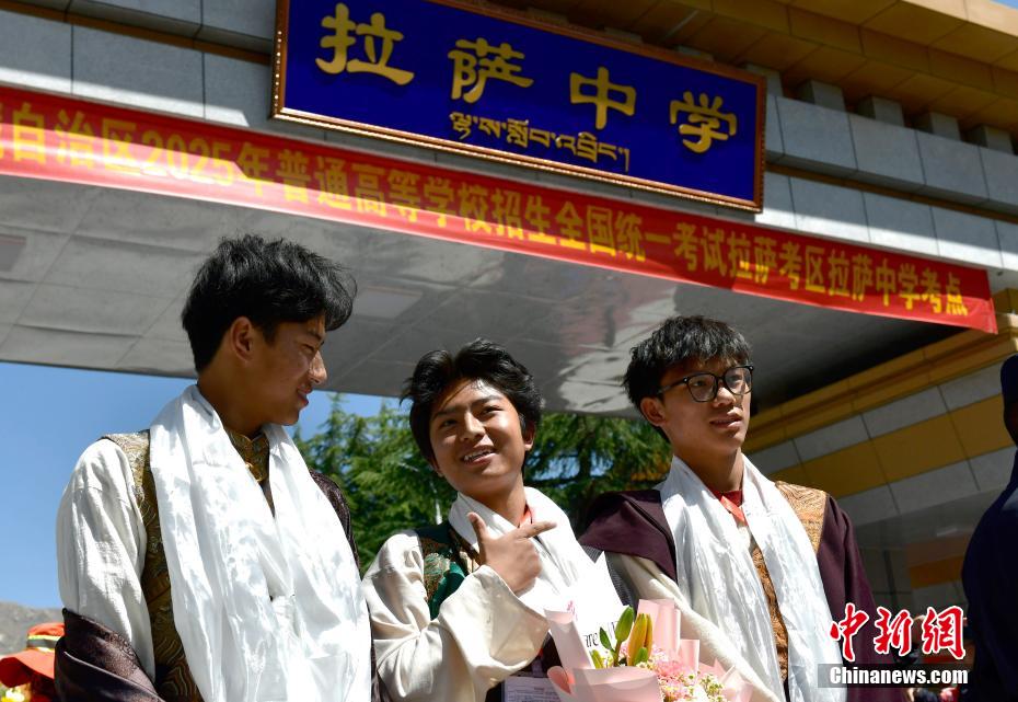 6月9日,西藏拉薩江蘇實驗中學考點外親友為考生送上哈達。當日,西藏自治區(qū)2025年普通高考完成所有科目考試,2025年西藏高考落下帷幕。中新社記者 貢嘎來松 攝