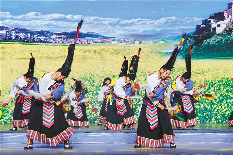 說(shuō)唱《聲生不息》以鏗鏘有力的節(jié)奏,再現(xiàn)世界最長(zhǎng)史詩(shī)《格薩爾王傳》中降魔濟(jì)世的英雄傳奇;舞蹈《達(dá)姆韻》以工布響箭舞步、熱瑪琴伴奏,將對(duì)生活的熱愛(ài)、對(duì)自然的敬畏,化作熱烈奔放的舞步,演繹著傳承千年的文化記憶,彰顯著工布獨(dú)特的生命張力與文化自信;《扎西央恰》將千年宣舞與噶爾舞創(chuàng)新融合,以莊重舒緩的舞步訴說(shuō)著高原先民對(duì)天地的敬畏,以雄渾激昂的鼓點(diǎn)展示雪域歷史的風(fēng)云激蕩,在莊重與激昂中訴說(shuō)阿里高原的歷史變遷……