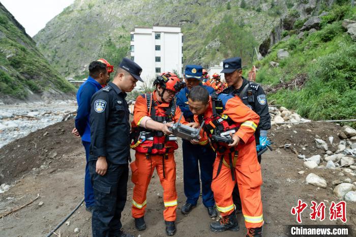 圖為9日,西藏移民管理警察與西藏消防等救援力量,操作無人機(jī)了解現(xiàn)場情況。肖富貴 攝