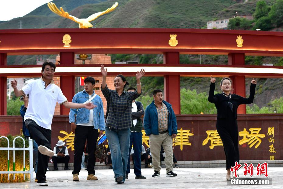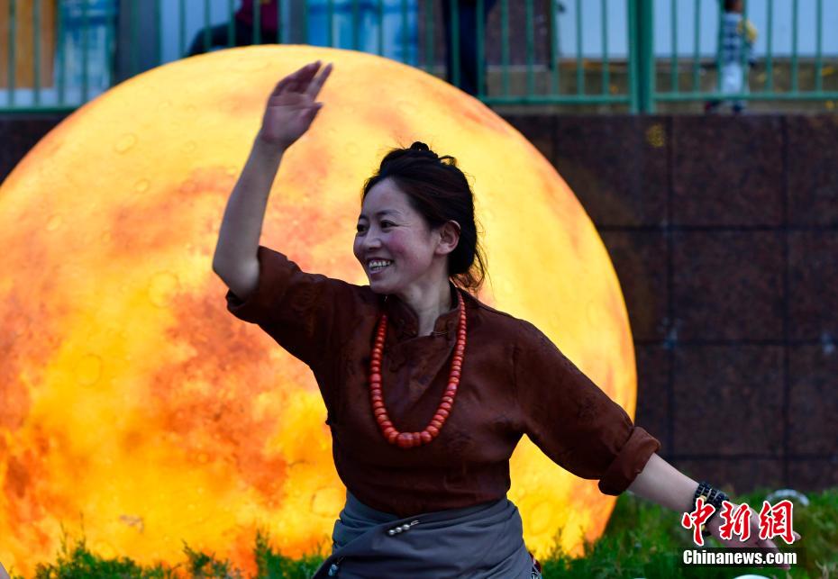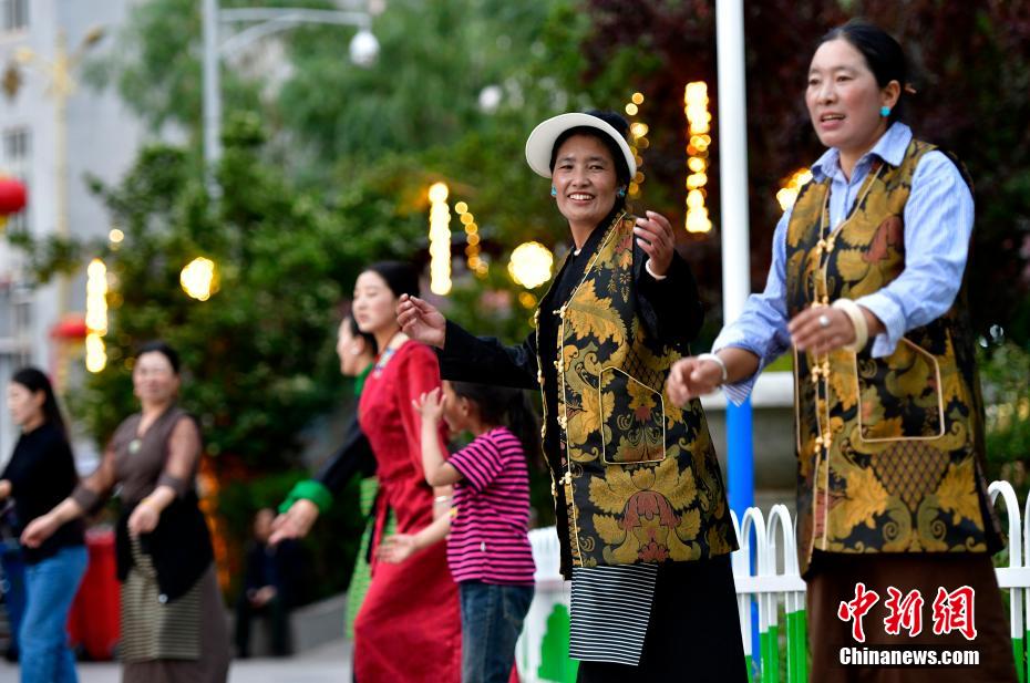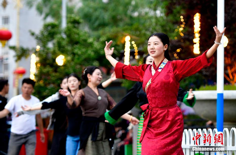 7月13日,西藏昌都瀾滄江天津廣場(chǎng)上,鍋莊舞愛(ài)好者踏歌起舞,舞出夏日夜間精彩。中新社記者 李林 攝