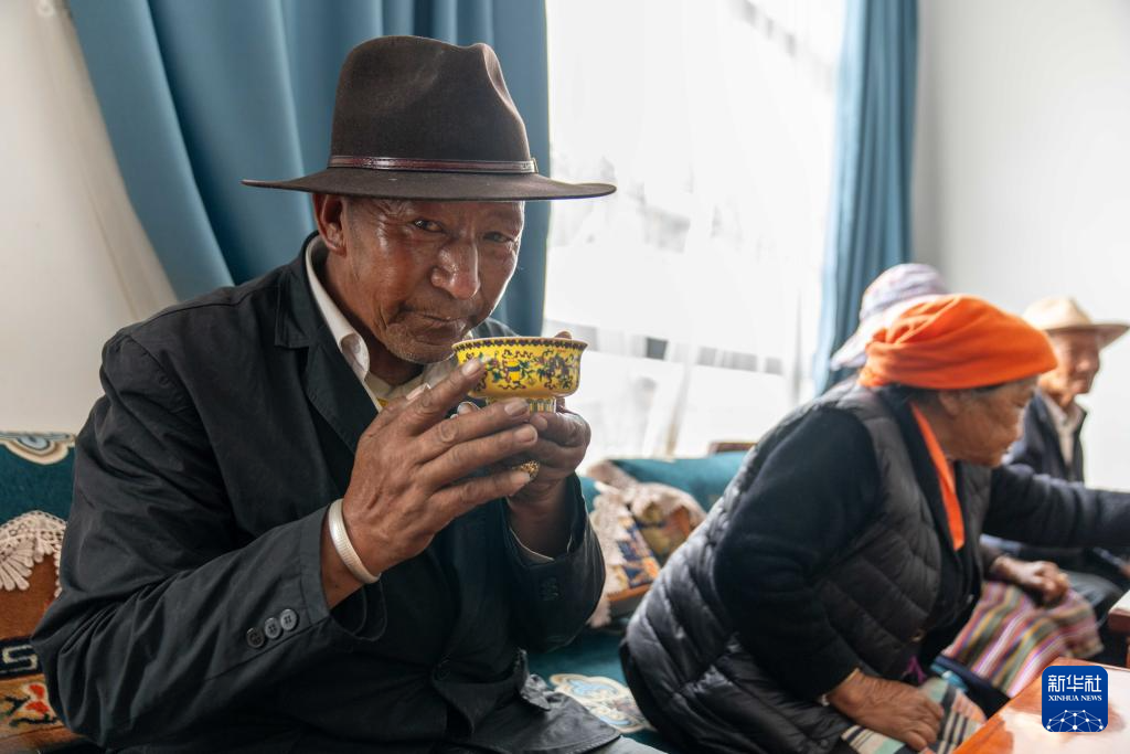 7月17日,洛桑群培老人在三有村幸福驛站日間照料室里喝茶。新華社記者 旦增尼瑪曲珠 攝