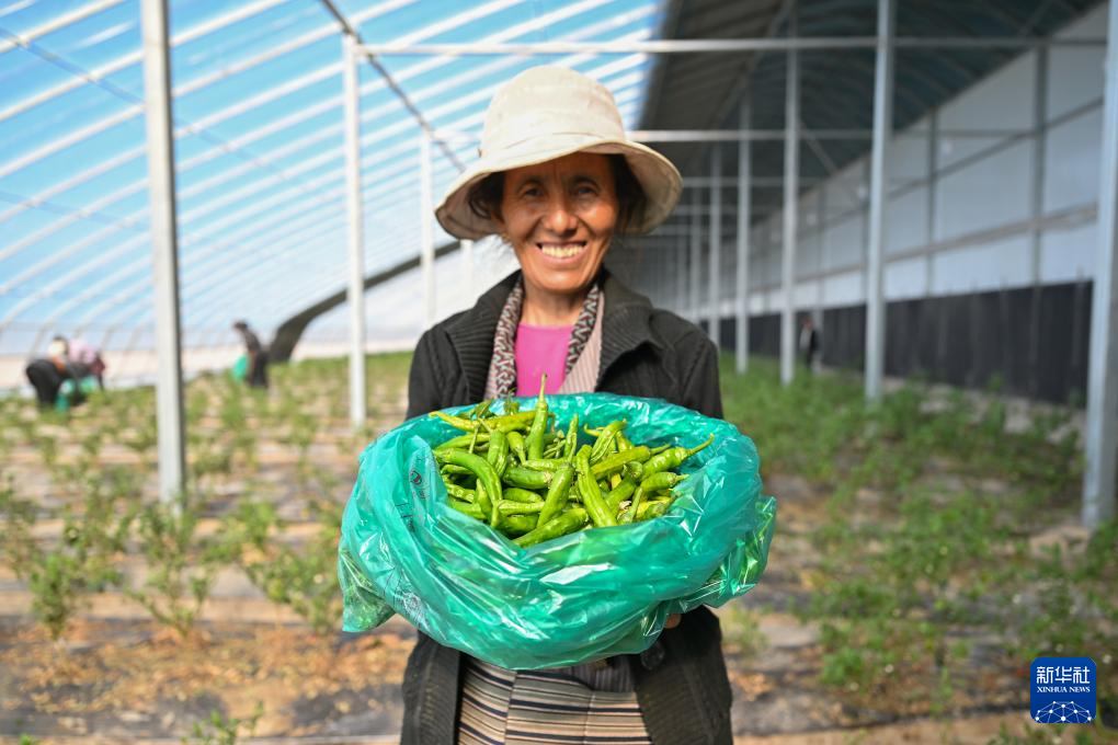 7月19日,西藏扎囊縣綠之源現(xiàn)代農(nóng)業(yè)科技股份有限公司的員工次旺拉吉展示剛采摘下來的有機(jī)辣椒。新華社記者 李鑫 攝