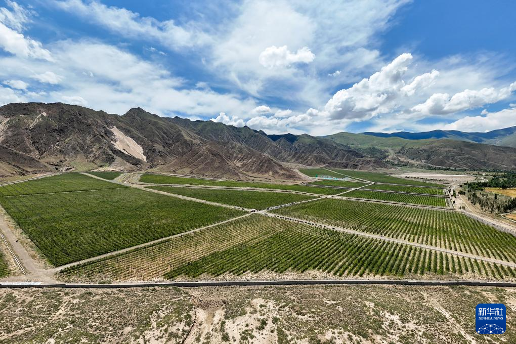 這是西藏扎囊縣的一處矮化蘋果種植園區(qū),采用現(xiàn)代農(nóng)業(yè)滴灌技術(shù),使水資源得到高效利用,還可以用果樹防風(fēng)固沙,讓沙化地變綠洲(無人機(jī)照片,7月19日攝)。新華社記者 李鑫 攝