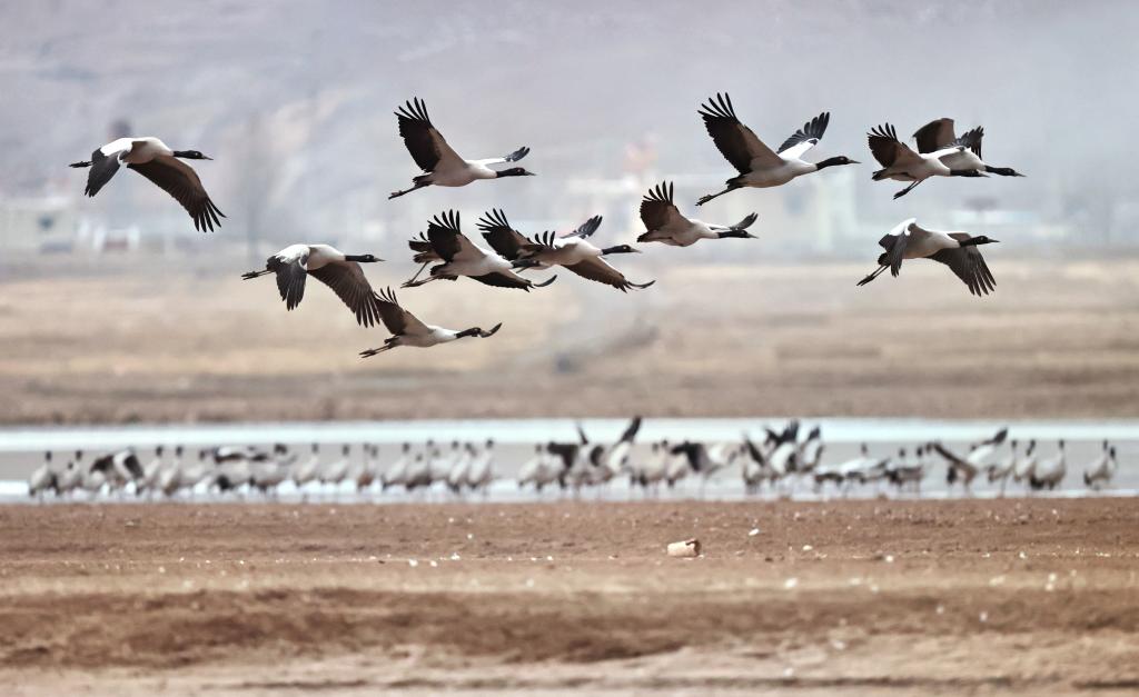 這是3月8日在拉薩市林周縣虎頭山水庫拍攝的黑頸鶴。新華社記者 丁增尼達 攝