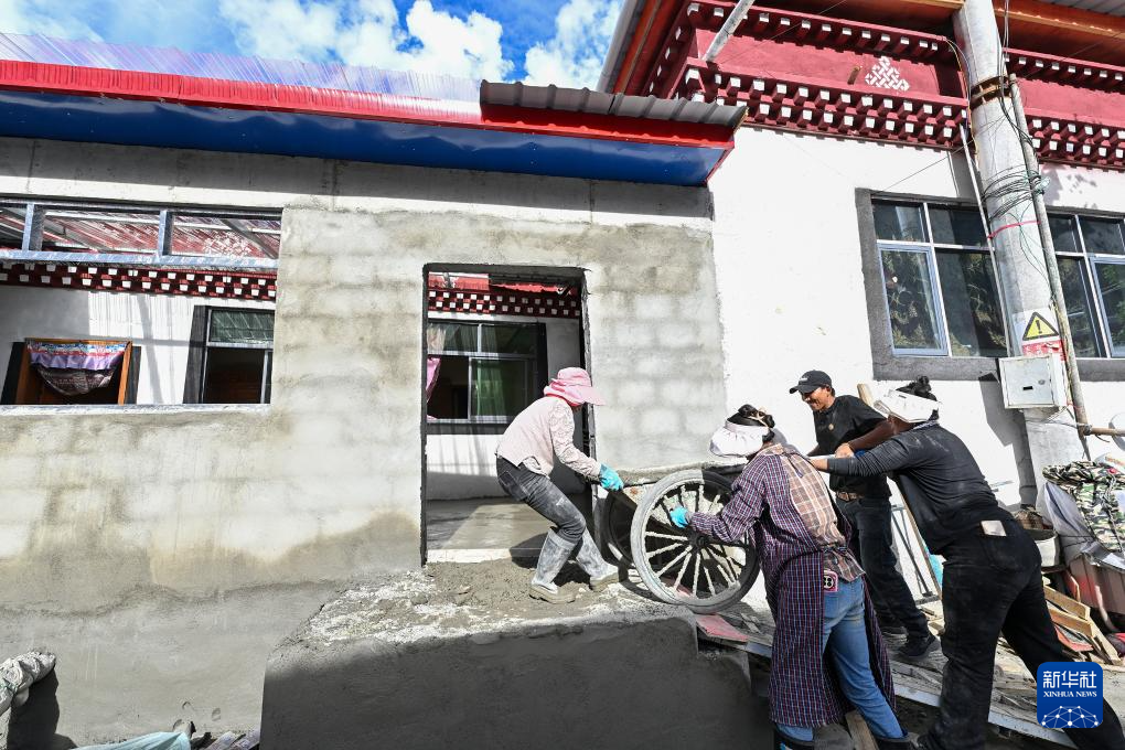 7月21日,51歲的拉丁雪村村民次旺羅布(右二)在村民的幫助下運輸建筑材料,改造提升自己的房屋。新華社記者 李鑫 攝