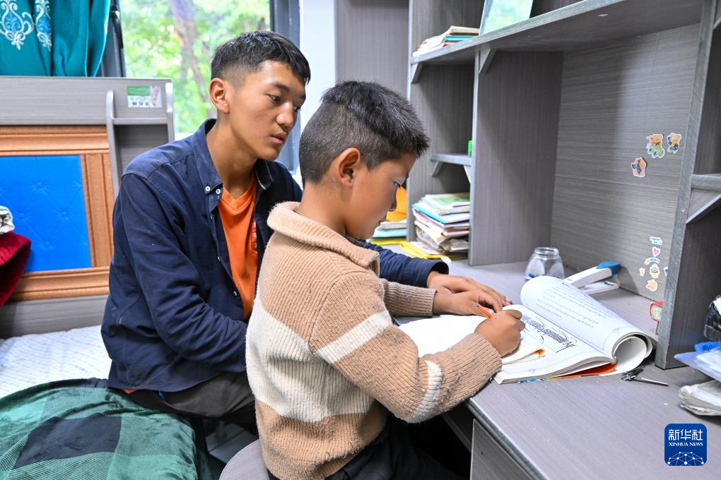 7月21日,17歲的米瑪次仁(左)在新房臥室內輔導7歲的弟弟堅阿達瓦寫作業(yè)。新華社記者 李鑫 攝